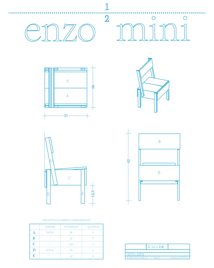 Enzo mini est une chaise en kit conçue d’après le projet « Autoprogettazione » d’Enzo Mari. Exposé pour la première fois en 1974, le projet de Mari consistait en une série de meubles en bois à fabriquer soi-même à partir de dessins et mesures simples, gratuits et accessibles. 50 ans plus tard, sur une invitation de Raphaël Giannesini, le projet Enzo mini rend hommage à l’œuvre du designer en proposant de diviser les plans d’une chaise en deux tout en gardant ses proportions. Présentée sous forme de meuble en kit à monter soi-même, la pièce s’accompagne d’un tirage évoquant les usages possibles d’un design à échelle réduite : « pour les enfants, les petits espaces, les artistes fatigué.es ou les collectionneurs du dimanche. »