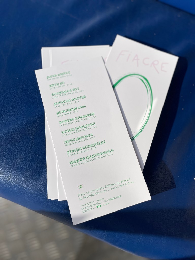 La FIACRE est une foire d’art itinérante sur vélo triporteur qui réunit les contributions de dix artistes fictifs. Conçue pour générer des interactions au niveau de la rue, la foire obéit aux aléas des rencontres et aux déplacements de son cocher. Acteur central, vêtu du maillot paré de rose et vert, le cocher présente le programme en cours, puis conduit et introduit le public aux œuvres exposées dans la ville. Gratuite, indépendante et spontanée, la FIACRE est née d’une tentative d’ouvrir et déplacer l’espace d’exposition vers un espace mobile, urbain et collectif.