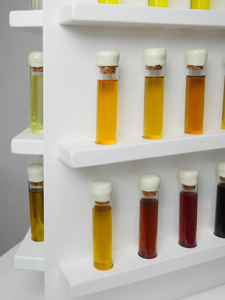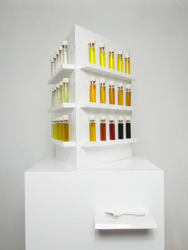 Huiles et combustibles est une collection de 46 huiles d’origine végétale, animale et minérale collectées durant l’été 2022. Créée à l’occasion du stand de lampes d’artistes Lumens (MoreProjects), la pièce renvoie aux origines de l’éclairage domestique en mettant en lumière l’huile comme source d’énergie. En référence aux lampes à graisse préhistoriques, la cuillère associée à la collection pastiche l’aspect sommaire des premières lampes tout en rappelant les usages multiples des huiles : alimentation, soin, carburant, artisanat.
