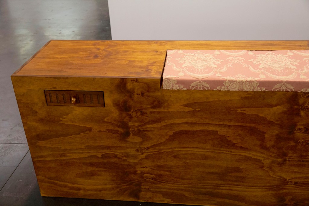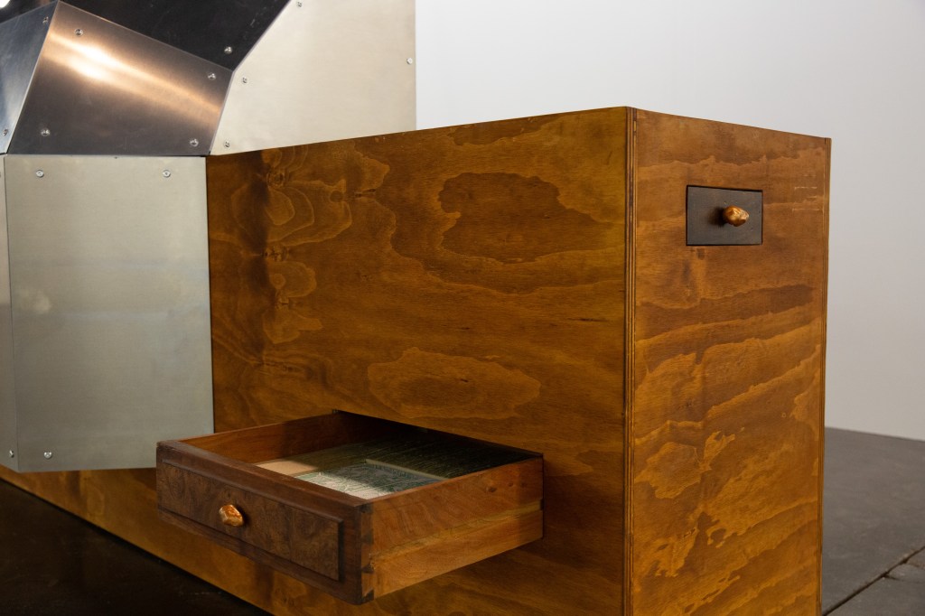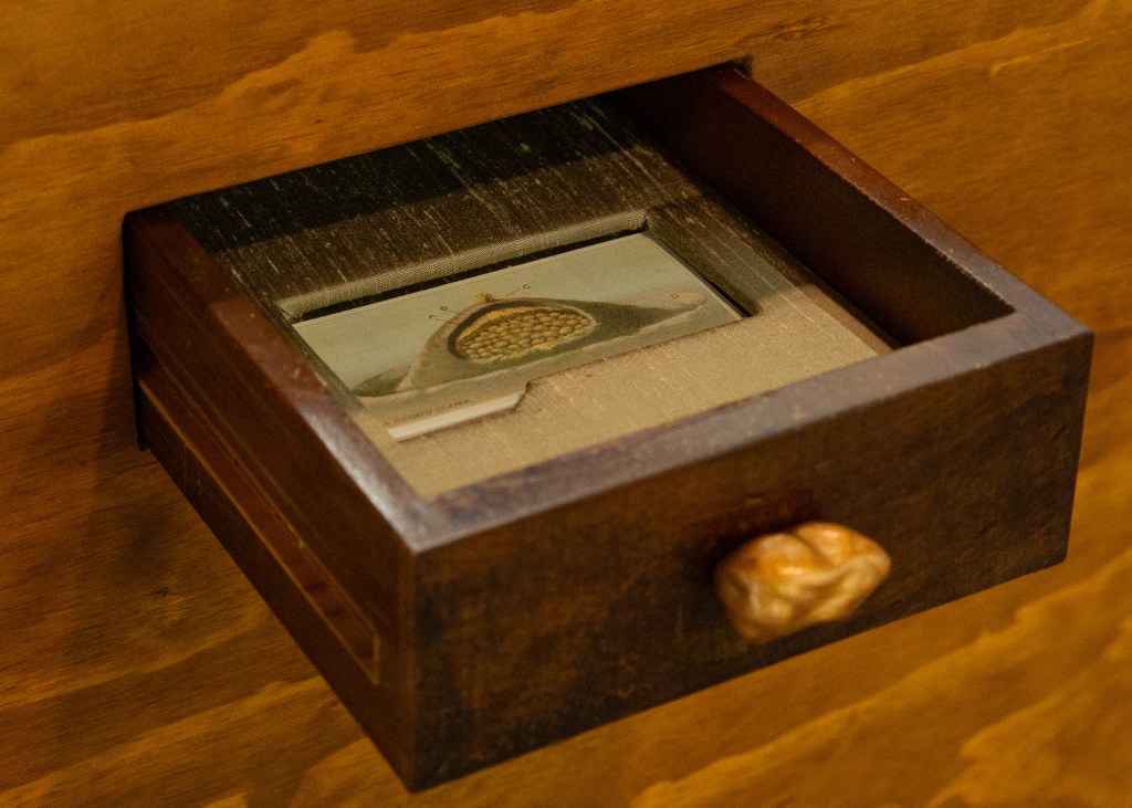 Husz, haunt, hôtes du duo Blankett (Juliette George et Rodrigue de Ferluc) s’est construit dans le cadre de la parution de La BF15 2025-2015, l’édition parue à l’occasion des 30 ans du centre d’art, sur une invitation de Perrine Lacroix. La pièce prend pour point de départ les emblématiques boites de bouquinistes qui jalonnent le quai de la Pêcherie à Lyon, où se situe également le centre d’art. Proposée ici en version miniature, la caisse de bouquiniste valorise l’endroit de l’édition comme celui de la création tel un objet précieux. Adapté non plus au parapet du quai, mais à un meuble à tiroirs en bois, le dispositif sert autant de support de réception que de système d’exposition et d’archivage. Il accueille notamment l’une des toutes premières représentations d’un atelier de typographie de la fin du XVème siècle. Extrait de la « Grant danse macabre des hommes et des femmes », cette gravure sur bois de Mathieu Husz de 1499 (ici une reproduction sur papier calque) met en scène les différentes étapes d’impression d’un livre : de la composition des lettres, à la presse puis à la vente. Imprimée à Lyon dans un atelier situé au 9 quai de la Pêcherie (à quelques mètres de l’actuel marché des bouquinistes et de La BF15) cette archive renvoie à la place historique de Lyon dans le développement de l’imprimerie en Europe et au statut particulier des imprimeurs, à la fois artisans, typographes et commerçants. Sont associées à cette gravure deux autres objets imprimés: une carte perforée IBM des années 1980 utilisée en informatique comme mémoire de stockage (et dont le système emprunte aux cartons perforés du métier Jacquard, commercialisé dès 1801) ; et un schéma en couleur d’un silo à patates (Potato clamp) initialement imprimé sur des paquets de cigarettes canadiens dans les années 1850 et dont la fonction de stockage et de protection peut renvoyer au livre autant qu’à la caisse même.
